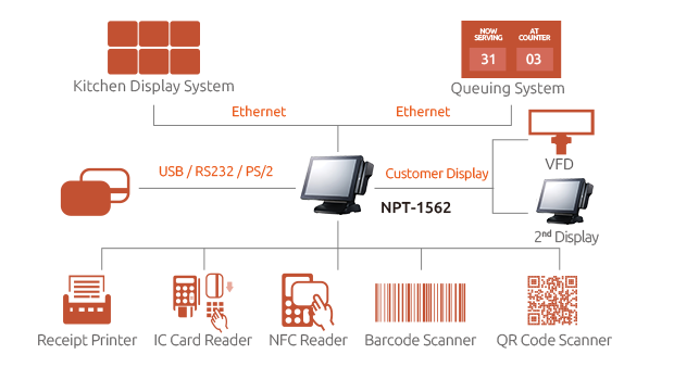 The NPT-1562 is a high value Point-of-Sale (POS) hardware solution designed to fulfill your POS hardware requirements. The quiet fanless design offers low power consumption and minimal maintenance. To reduce maintenance time and costs it comes with a removable HDD, MSR, fingerprint and VFD kit. The DC-12V output provides sufficient power for a second display from the POS terminal, as well as providing better cable routing and high-integration. The small footprint is ideal for installations where space is limited.